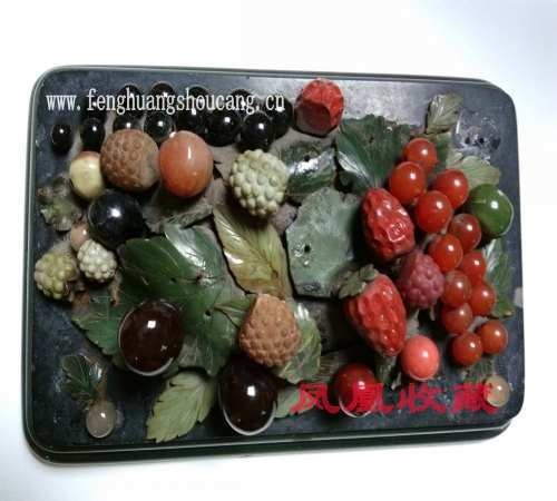 【清朝帝王的艺术审美度-是独步古今的!造就一批能工巧匠!有许多《精美绝伦的玉石珠宝盆景》!通常用各种玉石、玛瑙、翡翠、碧玺、松石等铸就而成!此盆景以【玉石为盆,青玉为叶,用各种玉石-玛瑙等-雕刻成葡萄-樱桃-荔枝-草莓-苹果等水果,惟妙惟肖,令人《望梅止渴!雕工精湛!构思巧妙-巧夺天工!