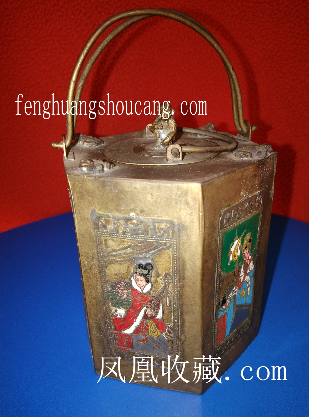 《银胎珐琅》工艺制作是根据需要镶以玛瑙、松石等做装饰。珐琅釉多种色彩晶莹、光滑具装饰性,作宫廷陈设用品,增添色彩,体现出皇帝的尊贵地位。【此银胎珐琅彩六面分别錾刻《古代四大美女图》,盖上镌刻四个青蛙及一猴《熠熠如生》!寓意四大美女的《亲眷连跳都已封为诸侯》!此暖酒壶造型独特,做工考究,纹饰精致,色彩艳丽,此《四大美女-银胎珐琅彩暖酒壶》传称是清宫旧藏。